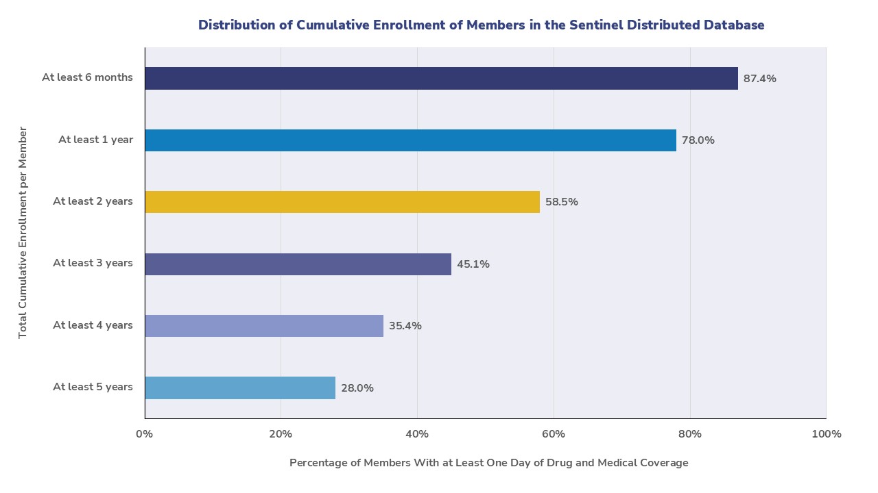 This graph shows the distribution of cumulative enrollment with medical and drug coverage per member within the Sentinel Distributed Database. An enrollment span is defined as having both medical and drug coverage. A single member may contribute multiple enrollment spans to the Sentinel Distributed Database. These are totaled to calculate cumulative enrollment per member. Last updated: 10/13/25